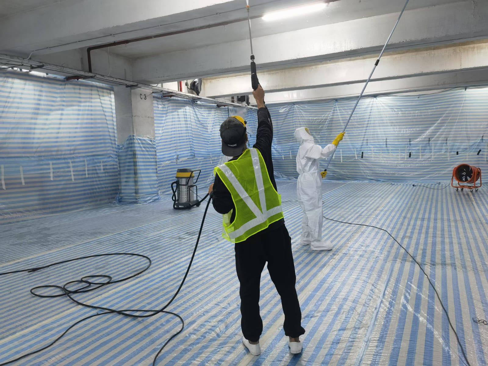 - Préparation : Nettoyage localisé, dépoussiérage, masquage des luminaires et sprinklers, légère abrasion mécanique si nécessaire.